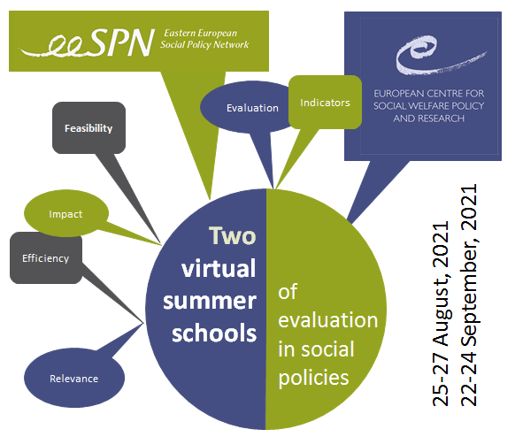 Two Bridge Building (BB) Summer Schools of evaluation in social policies took place online on 25-27 August and 22-24 September 2021 as part of the Bridging Function of the European Centre. They aim to enhance skills and knowledge in commissioning and/or conducting social policy-oriented monitoring and evaluation projects and programmes. The BB Summer Schools will stimulate an interactive, participatory, and reflective learning among the participants and they will bring together professionals to exchange and enhance their knowledge and expertise in monitoring and evaluation, and to contribute to regional cooperation for European integration by: