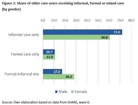 This Policy brief provides insights into the individual characteristics associated with the use of formal, informal and mixed care by older Austrians living in the community. While informal support still accounts for the majority of provided care, the supply of formal services has been constantly increasing, serving primarily very old individuals, those with higher support needs and women. Large gender differences in care use patterns are still observed in Austria and particularly pronounced among married and co-habiting older people.