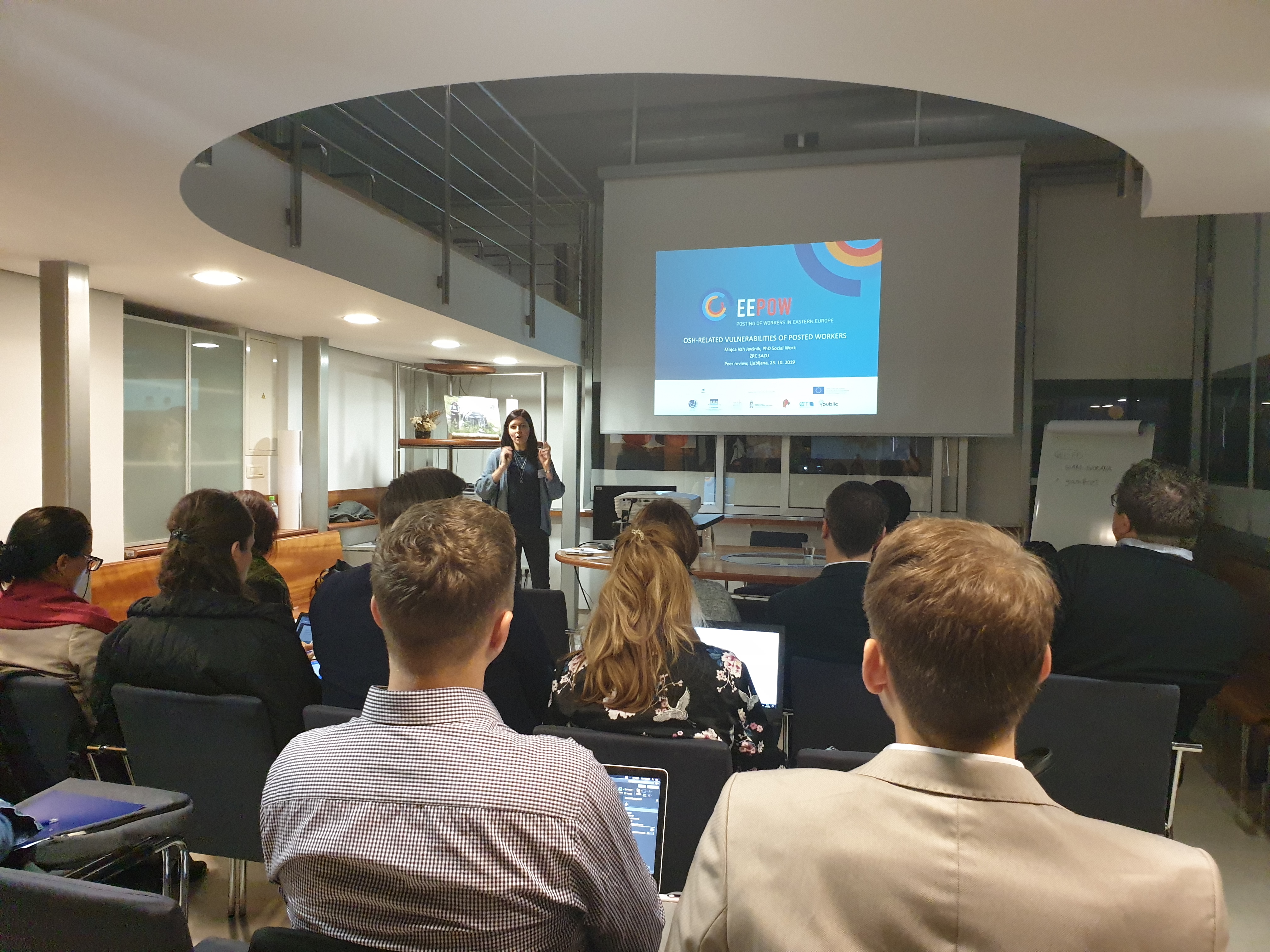 On the 23 October 2019, Research Centre of the Slovenian Academy of Sciences and Arts (ZRC SAZU) organized a peer review in the frame of the Posting of Workers in Eastern Europe (EEPOW) project. The focus of the peer review was on the occupational safety and health of posted workers in the European Union. The event was opened by Mojca Vah Jevšnik, ZRC SAZU, and our colleague Sonila Danaj. The first session focused on the Slovenian case with three presentations: OSH-related vulnerabilities of posted workers by Mojca Vah Jevšnik, ZRC SAZU, Ljubljana; Providing safe and healthy working conditions of posted workers by Katarina Železnik Logar, Institute for Occupational Safety, Ljubljana; and What is a (much too often) daily reality of the OSH for posted workers? by Goran Lukič, Counselling office for workers, Ljubljana. In the next session, Rossana Cillo, University of Venice Ca‘ Foscari and Piotr Mazurek, Fair Mobility Project, presented the cases of Italy and Germany, respectively, as peer countries.