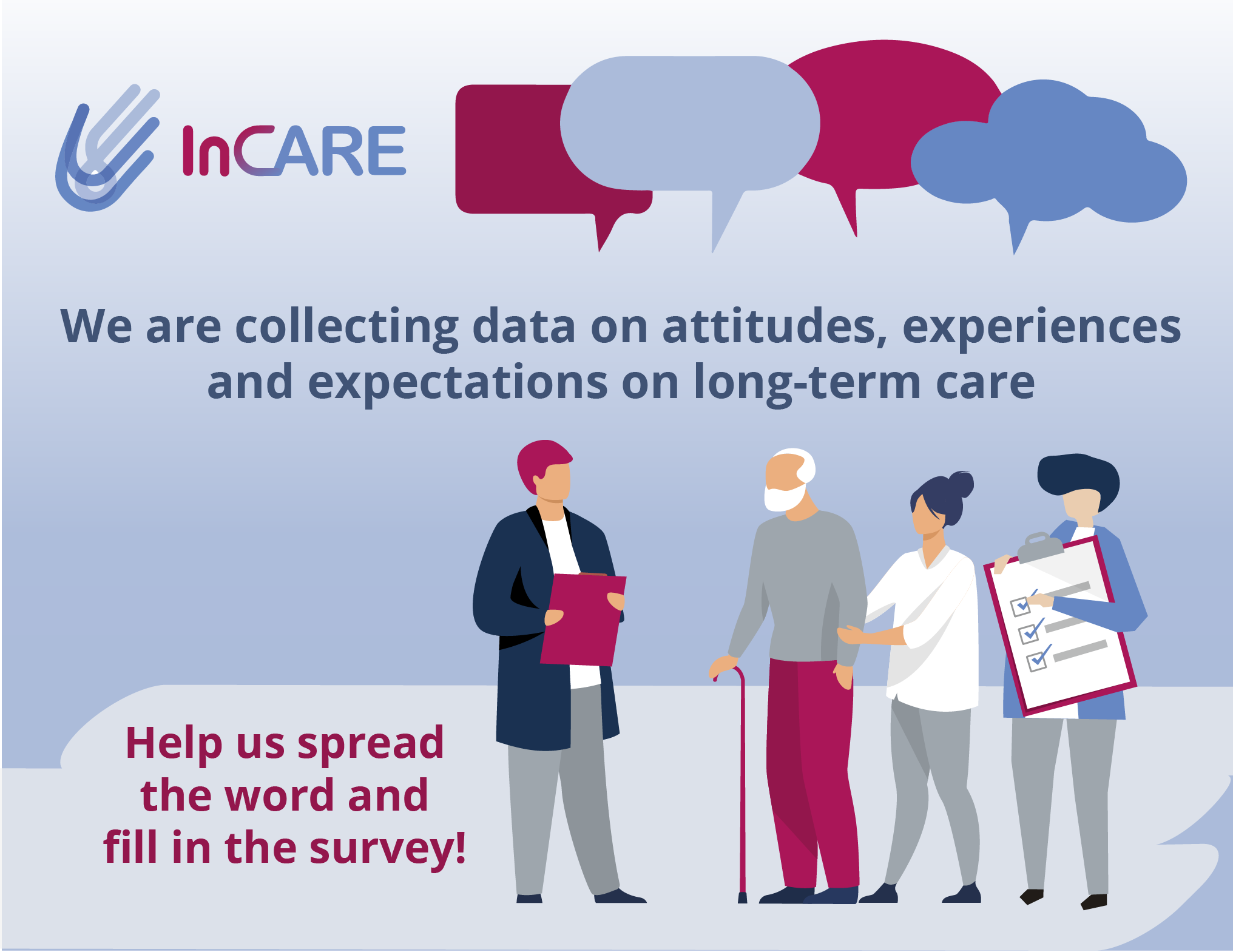 Please help us collect a large number of contributions to the InCARE survey on attitudes, experiences and expectations on long-term care. The aim of the survey is to understand how people view care for older people with support needs and how they assess long-term care systems. Findings from this study will be used to raise awareness of the challenges faced by older people with care needs and their families, to advocate for policies that can support them, and to help design better support systems for older people, their families and communities. Read more about the collection of the Incare survey.