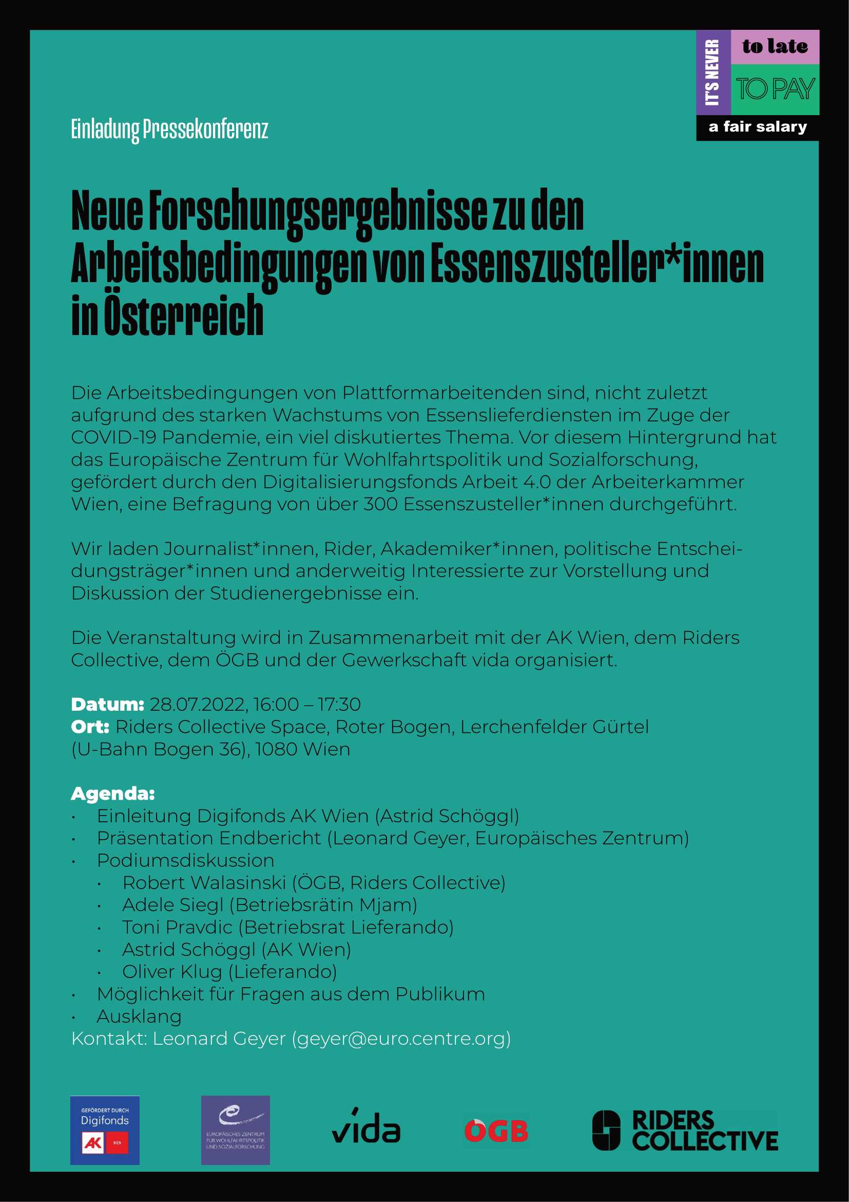 The European Center gathered new data on the working conditions and trade union attitudes of food delivery riders in Austria. Join us for a presentation and discussion of the results at Riders Collective Space Vienna, on 28 July 2022 starting from 16:00.
