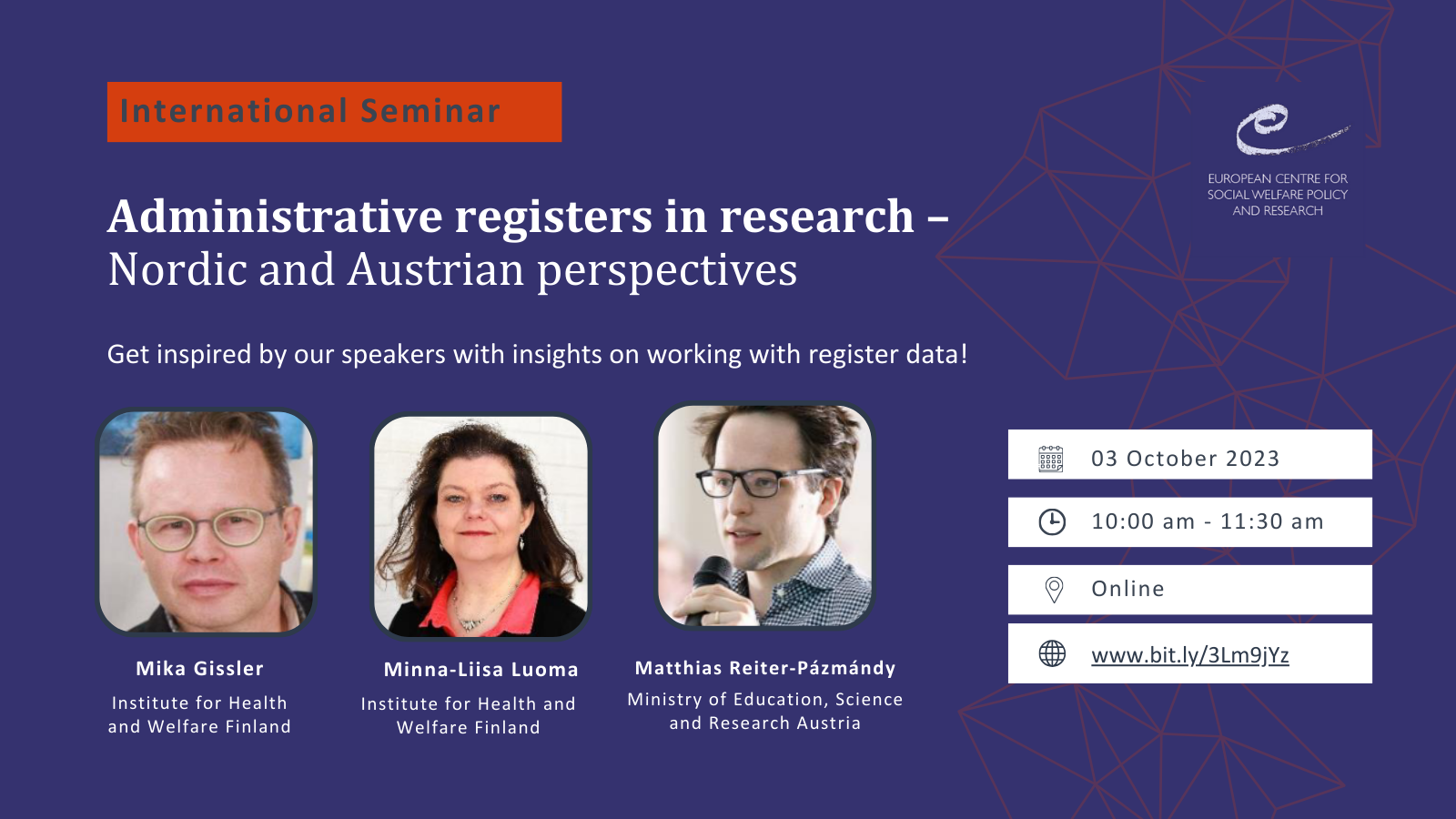 This international seminar aims to provide a comparative view on research with register data in the Nordic countries and in Austria. Professor Mika Gissler and Minna-Liisa Luoma (THL – Finnish Institute for Health and Welfare) will outline the rationale and framework conditions for register data research in the Nordic countries. Matthias Reiter-Pázmándy (Austrian Federal Ministry of Education, Science and Research) will contribute an overview of the current situation and future perspectives in Austria. Read more with the link on the right hand side.