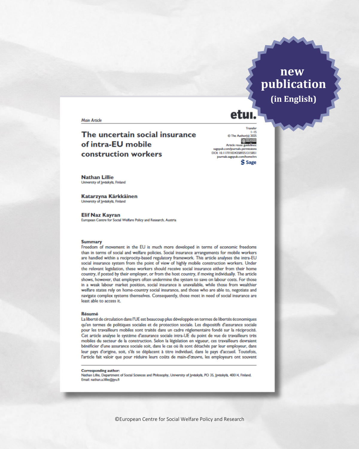 Elif Naz Kayran co-authored an article which analyses the intra-EUsocial insurance system from the point of view of highly mobile construction workers. Under the relevant legislation, these workers should receive social insurance either from their home country, if posted by their employer, or from the host country, if moving individually. The article shows, however, that employers often undermine the system to save on labour costs. For those in a weak labour market position, social insurance is unavailable, while those from wealthier welfare states rely on home-country social insurance, and those who are able to, negotiate and navigate complex systems themselves. Consequently, those most in need of social insurance are least able to access it.