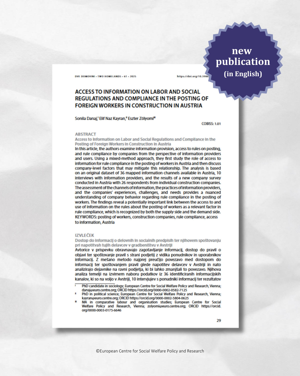 A special section with articles on the nexus between company profiles, access to information, and rule compliance in the posting of workers was published by the Two Homelands journal. The special section includes articles authored by our colleague Sonila Danaj (Introduction), Frederic De Wispelaere and Lynn De Smedt (HIVA KU Leuven) on the profile of the posting companies from Slovenia, our colleagues Sonila Danaj, Elif Naz Kayran, and Eszter Zólyomi on access to information and posting rule complaince in Austria, and Mojca Vah Jevšnik (ZRC SAZU) on access to information on the posting of Third-Country Nationals in Slovenia. The findings of these articles are drawn from research conducted in the frame of the INFO-POW project implemented in 2022-2024.