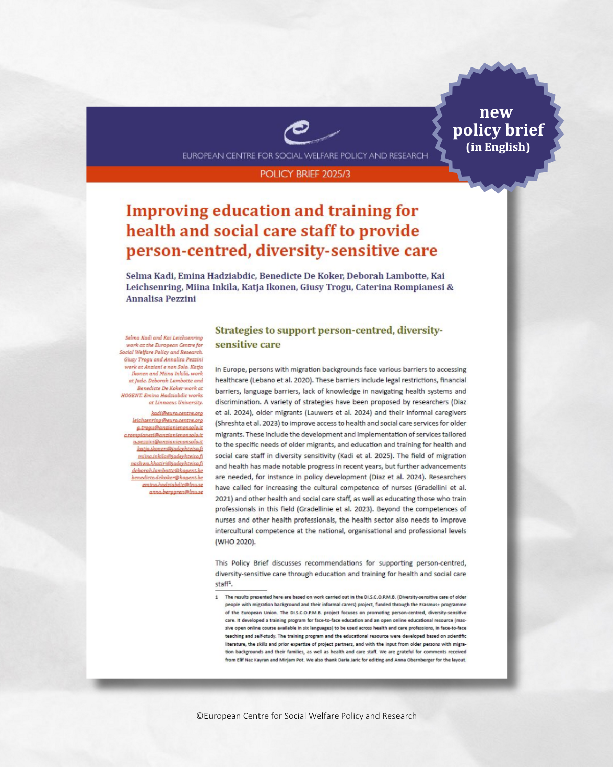 Older migrants face diverse barriers in accessing health and social care. The field of migration and health has made notable progress in recent years, but further advancements are needed, for instance in policy development (Diaz et al. 2024). One way to improve care for older migrants is through education policy. This Policy Brief presents recommendations on education and training to support health and care staff in developing skills in person-centred, diversity-sensitive further. Read more by clicking the link on the right-hand side.