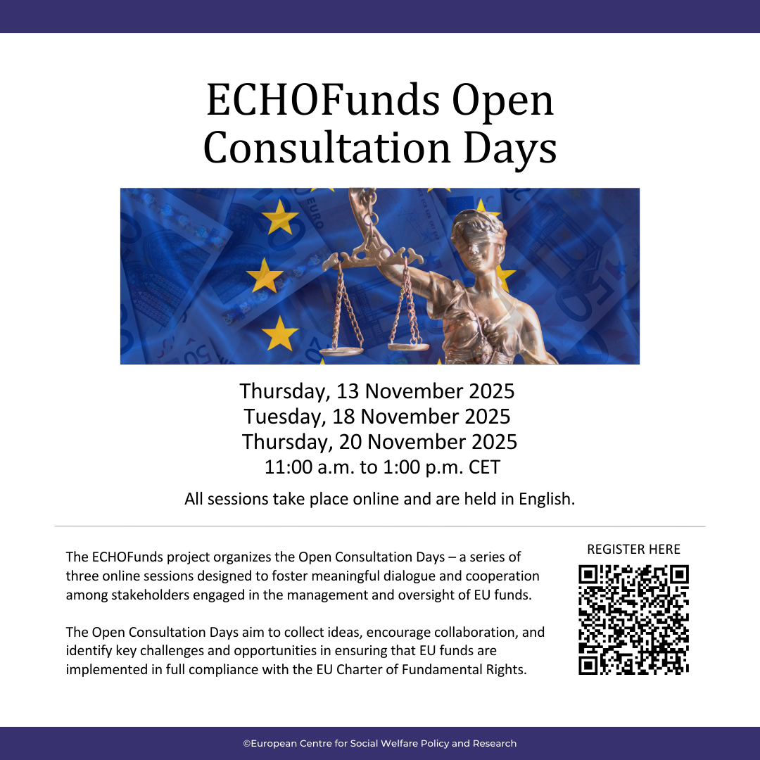 The ECHOFunds project organizes the Open Consultation Days – a series of three online sessions designed to foster meaningful dialogue and cooperation among stakeholders engaged in the management and oversight of EU funds. The Open Consultation Days aim to collect ideas, encourage collaboration, and identify key challenges and opportunities in ensuring that EU funds are implemented in full compliance with the EU Charter of Fundamental Rights.