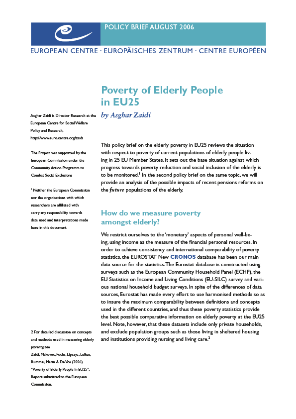 The European Centre has initiated a publication series of policy briefs, which provides a synthesis of issues of research and policy advice on which the European Centre researchers had been working recently. The first policy brief 'Poverty of elderly people in EU25', arise out of our work in the project supported by the European Commission under the Community Action Programme to combat social exclusion. This policy brief analyses poverty risks faced by the current populations of elderly people in the latest year (ie. around 2003).