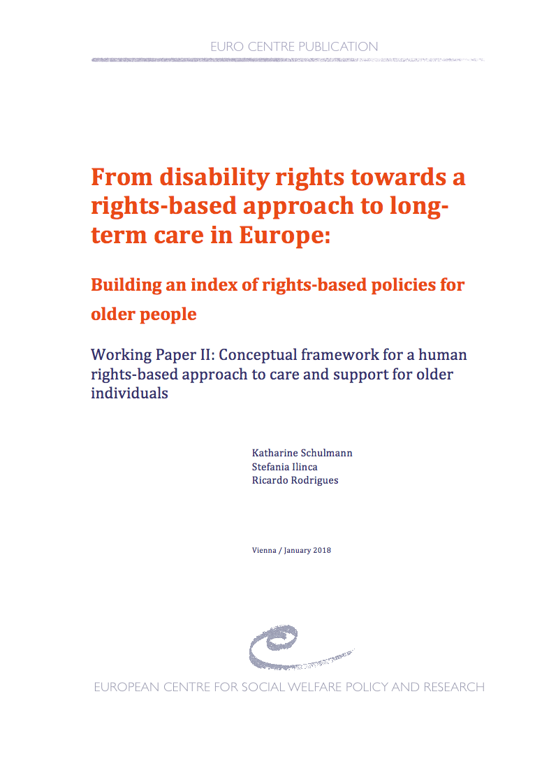 Countries across Europe are confronting the social, economic and political challenges of an ageing population. Among the most pressing of these challenges is the organisation and financing of long-term care and support for older people. While people are living longer than previous generations, they are not necessarily living these additional years in good health, and most will require some form of care or assistance in later life (Colombo et al., 2011). This working paper, the second in the series attached to the project “From disability rights towards a rights-based approach to long-term care in Europe: Building an index of rights-based policies for older people”, presents a conceptual framework for a human rights-based approach to care and support services, and attempts to detail what the fulfilment of universal human rights entails when applied to the particular case of older people with care and support needs.