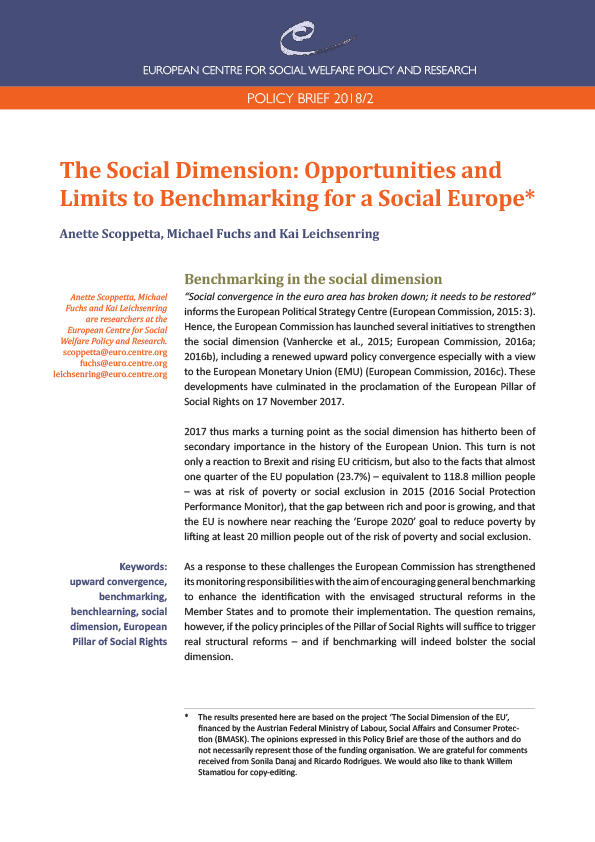 The Austrian Federal Ministry of Labour, Social Affairs and Consumer Protection therefore commissioned the European Centre for Social Welfare Policy and Research to identify key thematic areas for potential benchmarking processes in the social field during the next potential upward policy convergence. The study (Scoppetta et al., 2017) set out to discuss the pros and cons of the benchmarking process in the social dimension, its benchmarks and corresponding social indicators, in particular by focusing on minimum income schemes as a case for a benchmarking exercise suggested by the European Commission.