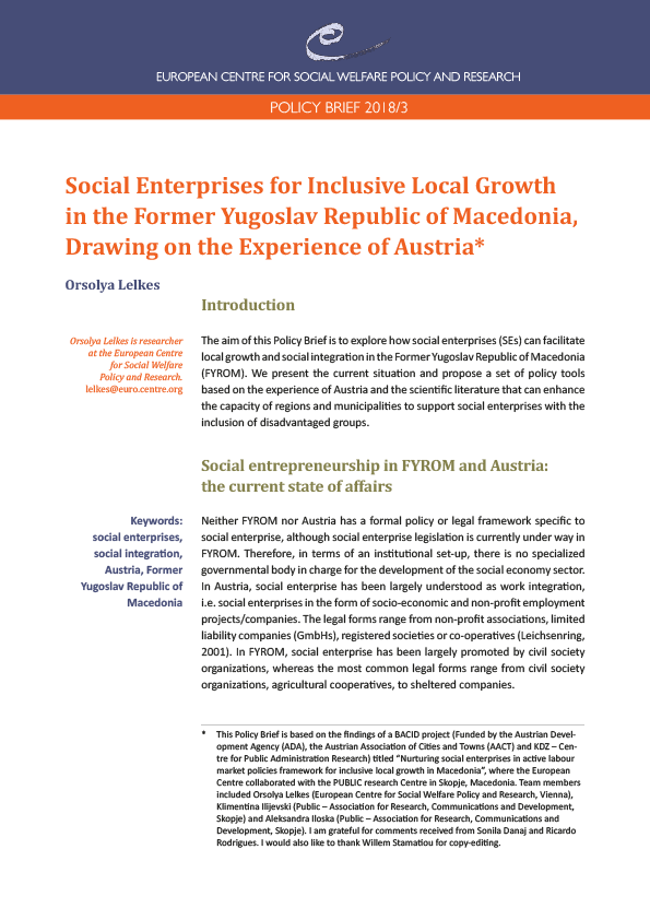 This policy brief on 'Social enterprises for inclusive local growth in the Former Yugoslav Republic of Macedonia, drawing on the experience of Austria' aims to explore how social enterprises (SEs) can facilitate local growth and social integration in the Former Yugoslav Republic of Macedonia (FYROM). We present the current situation and propose a set of policy tools based on the experience of Austria and the scientific literature that can enhance the capacity of regions and municipalities to support social enterprises with the inclusion of disadvantaged groups.