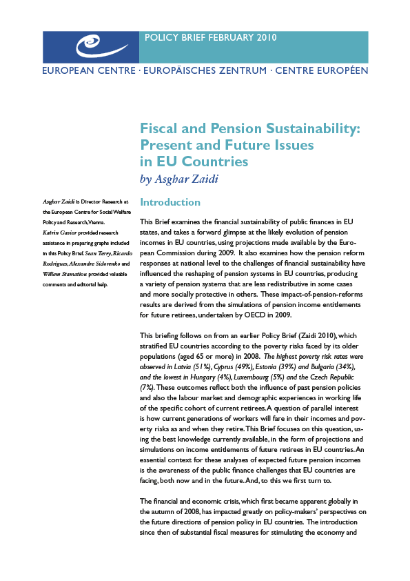 As an essential context, this Brief examines the financial sustainability of public finances in EU states. This is followed by a forward glimpse at the likely evolution of pension incomes in these countries, using projections made available by the European Commission during 2009. It also examines how the pension reform responses to financial sustainability challenges have influenced the reshaping of pension systems into a variety of systems that are less redistributive in some cases and more socially protective in others. These impact-of-pension-reforms results are derived from the OECD simulations of pension income entitlements for future retirees. This briefing follows on from an earlier Policy Brief “Poverty Risks for Older People in EU Countries – An Update”, which stratified EU countries according to the poverty risks faced by its older populations (aged 65 or more) in 2008.