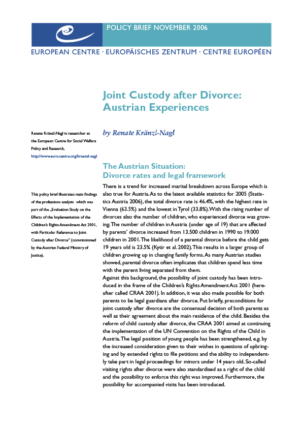 Our third policy brief illustrates the main findings of a professions analysis carried out by Renate Kränzl-Nagl from the European Centre and Christa Pelikan from the Institute for the Sociology of Law and Criminology. This analysis was part of the 'Evaluation study on the effects of the implementation of the Children's Rights Amendment Act 2001, with particular reference to joint custody after divorce' (commissioned by the Austrian Federal Ministry of Justice).