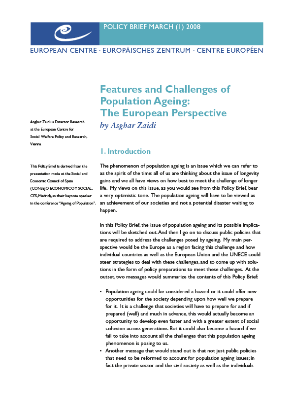 In this Policy brief the issue of population ageing and its possible implications are sketched out. It also discusses what public policy responses are required to deal with the challenges posed. The main focus would be on Europe as a region facing these challenges and how individual countries as well as the EU and the UNECE could steer strategies to deal with them.
