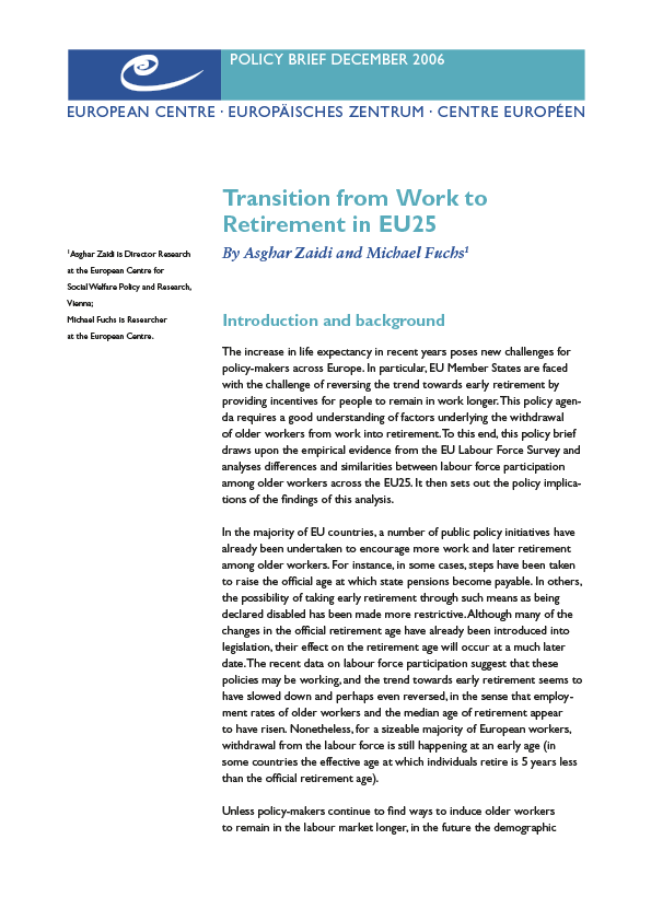 This policy brief had been produced for the European Commission (DG Employment, Social Affairs and Equal Opportunities) within the project 'European observatory on social situation'. It draws upon the empirical evidence from the EU Labour Force Survey, by analysing differences and similarities across the EU25 with respect to the labour force participation among older workers. It also sets out the policy implications by arguing that the policy agenda that needs to be followed is one of "flexible later retirement". To achieve this, there is a need for additional incentives in the system to enable people not just to move between jobs in later working life but also to work part-time without losing their entitlement to benefit. Such policy incentives should encourage older workers to avoid the phenomenon of a "cliff-edge" fall from full-time work directly into retirement that many of them often face.