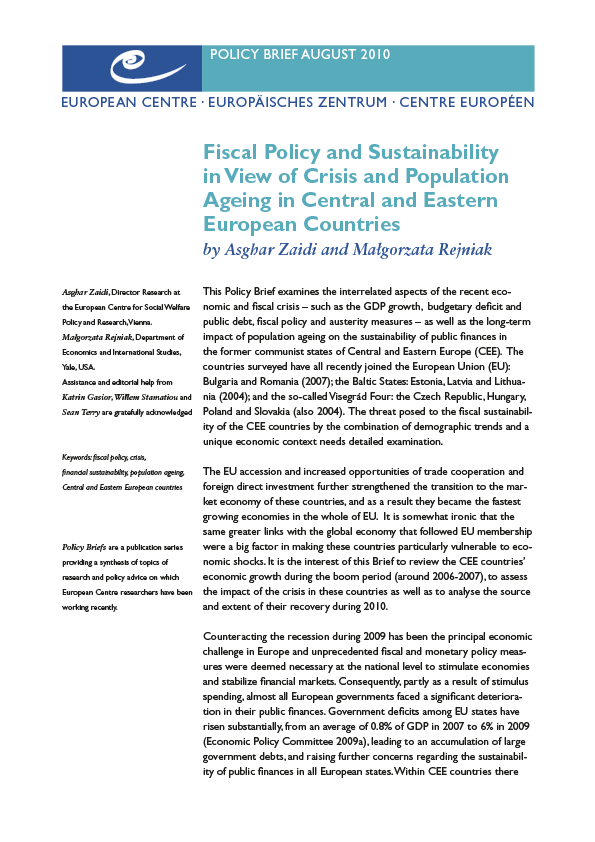 This Policy brief examines the interrelated aspects of the fiscal and economic policy as well as the impact of population ageing on the sustainability of public finances in the wake of the recent economic crisis.