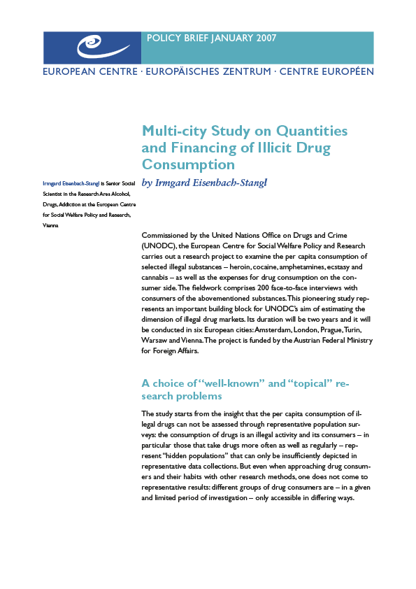 Commissioned by the United Nations Office on Drugs and Crime (UNODC), the European Centre for Social Welfare Policy and Research carries out a research project to examine the per capita consumption of selected illegal substances - heroin, cocaine, amphetamines, ecstasy and cannabis - as well as the expenses for drug consumption on the consumer side. The fieldwork comprises 200 face-to-face interviews with consumers of the abovementioned substances. This pioneering study represents an important building block for UNODC's aim of estimating the dimension of illegal drug markets. Its duration will be two years and it will be conducted in six European cities: Amsterdam, London, Prague, Turin, Warsaw and Vienna. The project is funded by the Austrian Federal Ministry for Foreign Affairs.