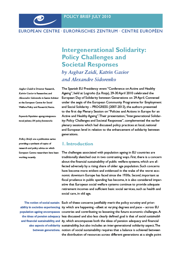 This Policy Brief addresses these inter-generation policy challenges and appraises the progress made so far within international policy frameworks (from UN and the European Commission) while also reporting on the opinions of European citizens on the challenges of intergenerational solidarity. The results are drawn from the Flash Eurobarometer survey of 2009, conducted by the GALLUP organisation, sponsored by the European Commission.