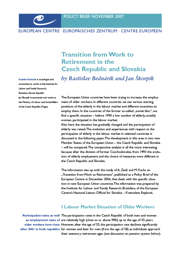 The present bolicy brief reports differences in the participation of the elderly in the labour markets of two new Member States of the European Union - the Czech Republic and Slovakia. The comparative analysis is all the more interesting because after the division of Czechoslovakia in 1993, the evolution of elderly employment and the choice of measures have been different in these countries.
