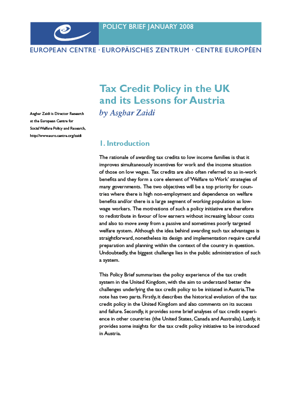 This Policy brief summarises the policy experience of the tax credit system in the United Kingdom, with the aim to understand better the challenges underlying the tax credit policy to be initiated in Austria. Perhaps the strongest message for Austria is: "keep it simple", as the benefit simplicity will help to effectively implement, monitor and evaluate the experience of the tax credit policy. It is also imperative that a good and tested IT system is put in place before introducing the scheme. The success of the tax credit policy in Austria will also depend on the contextual factors, such as the interplay with other tax and benefit and labour market policies, wage setting arrangements, etc, and more background research on the effect of these factors will be useful. A pragmatic approach would be to introduce, in the first instance, a tax credit scheme for specific subgroups, such as lone parent families and working age persons with disabilities.