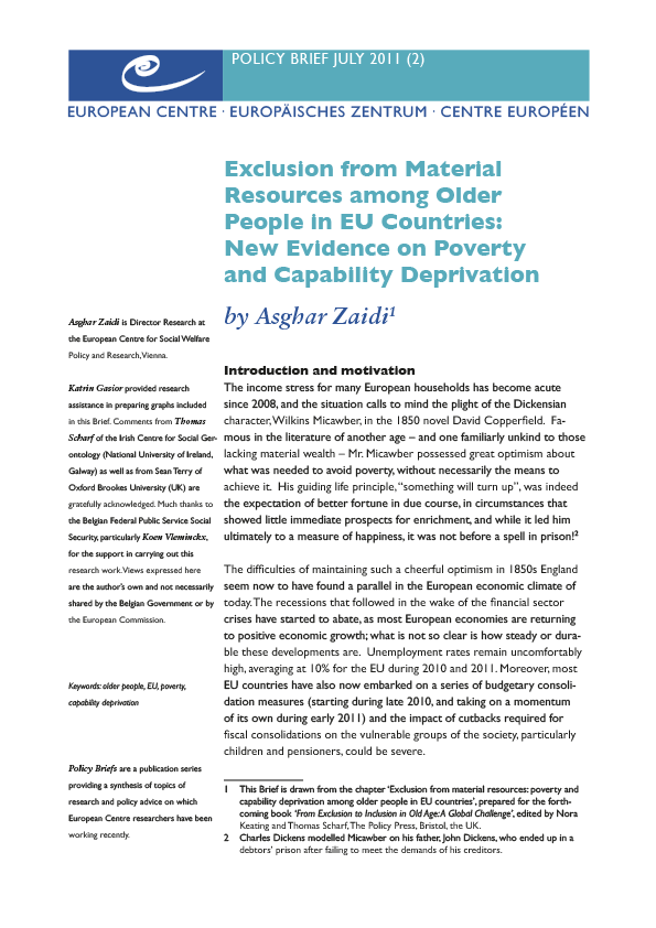 This Policy Brief examines the picture for the current generation of older people, with particular reference to their exclusion from material resources, an absence which triggers and identifies other forms of exclusions for older people. Income is used as a primary measure of exclusion (following Atkinson), but Sen's ideas, emphasising agency freedom and capability aspects of welfare, are also adopted. What emerges is a degree of variation in the relative ranking of countries according to which of the two measures is adopted. The capability approach measures alter significantly the relative ranking of EU countries when compared with the income-based measure. Eastern European EU countries fare much worse in terms of capability deprivation of older people, while the Western European countries improve in their relative standing. What emerges is the clear methodological implication that income-based measures provide only an incomplete picture and must be complemented with non-monetary measures (such as capability deprivation measures reported in this Brief) for a more satisfactory snapshot of the material conditions of older Europeans.