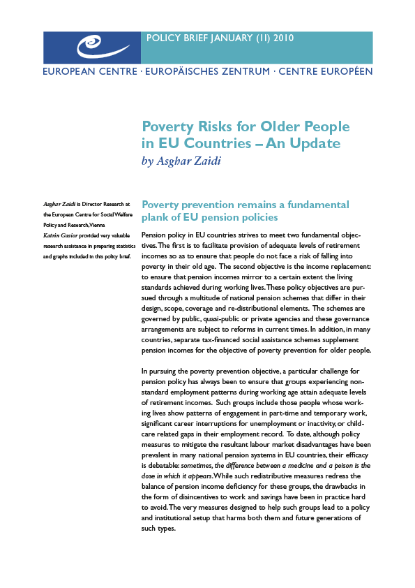 This Policy Brief provides the latest evidence on how EU countries differ in terms of poverty risks for older people (aged 65 years and over).
