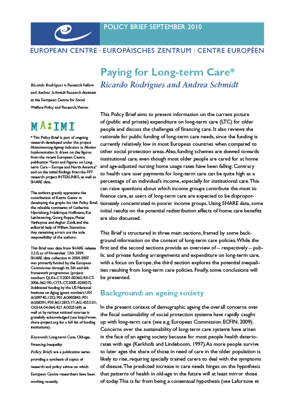 Available data from national and international sources as well as qualitative information gathered in the European Centre's recent publication "Facts and Figures on Long-term Care -- Europe and North America" is used to shed light on these issues. On the other hand - given that user payments for long-term care can be quite high as a percentage of an individual's income (especially for institutional care) - this Policy Brief provides preliminary results on potential redistribution effects of home care benefits (based on SHARE data). By that, the Policy Brief tries not only to take a policy-oriented, comparative view on funding arrangements for long-term care but also to serve as a starting point for further discussions on the potential inequalities associated with the different ways of financing and providing long-term care.