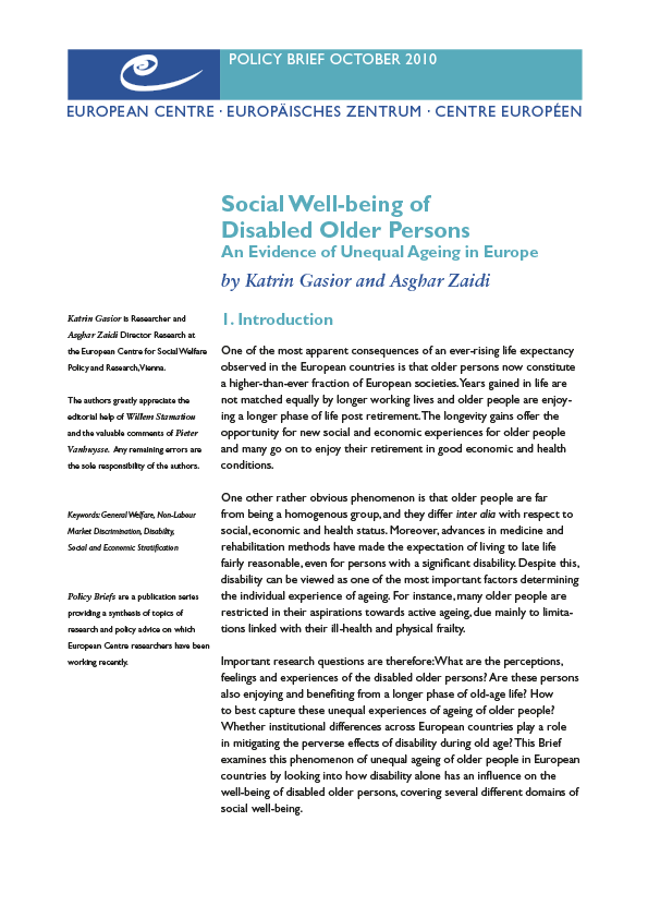 The Policy Brief examines the well-being of disabled older persons living in European countries, by analyzing various social dimensions such as satisfaction with present situation and living standards, future optimism, respect and social contacts.
