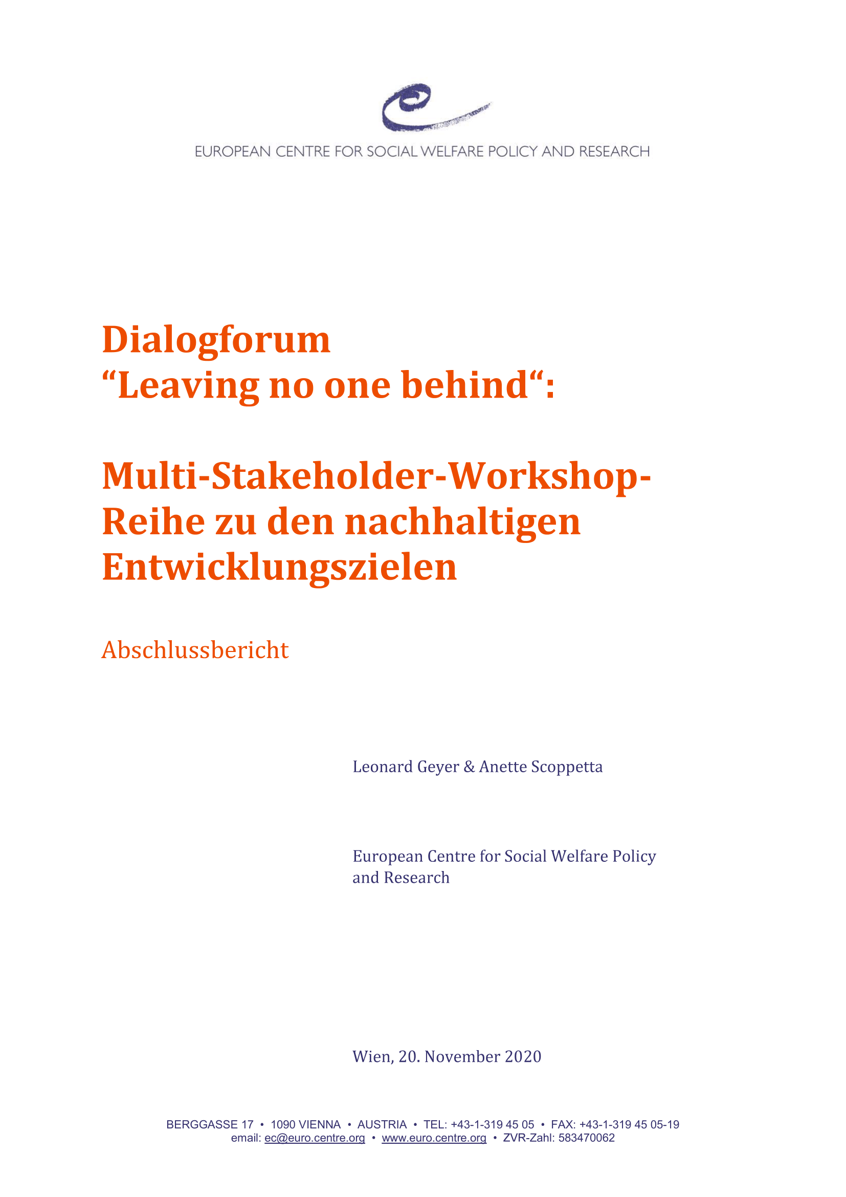 The dialogforum Leaving no one Behind consisted of four multi-stakeholder workshops on the implementation of the Sustainable Development Goals (SDGs) in Austria. This report describes the workshops and their results and formulates recommendations on how the work of the forum should be continued. Additional information on each workshop is available in a separate annex.