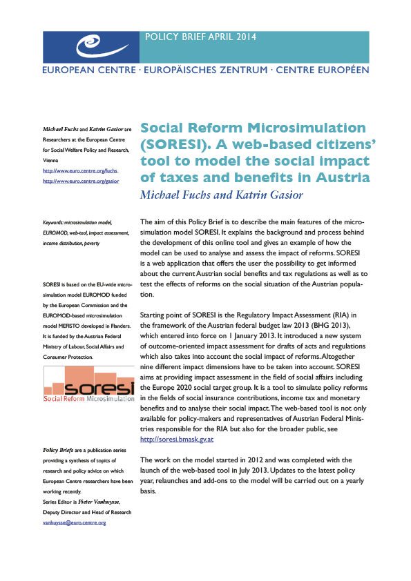 A new system of Regulatory Impact Assessment (RIA) in Austria was introduced via the federal budget law 2013. In the framework of the decree RIA-Social, enacted by the Austrian Federal Ministry for Social Affairs, the outcomes for the income situation of the Europe 2020 social target group (persons at risk of poverty, materially deprived persons, persons in households with no or low work intensity) should be estimated. The estimation is carried out via the user-friendly microsimulation model SORESI. Responsible civil servants are able to manipulate monetary social benefits on a website and the model quickly calculates the outcomes on the income situation of the Europe 2020 social target group. At the same time the website can be used by the general public for other simulations (incl. social insurance contributions and income tax) and inquiries (e.g. outcomes on the income distribution, outcomes for certain socio-economic groups, budgetary consequences). This Policy Brief describes the most important features of the SORESI model and presents a policy reform example related to the increase of the family allowance.