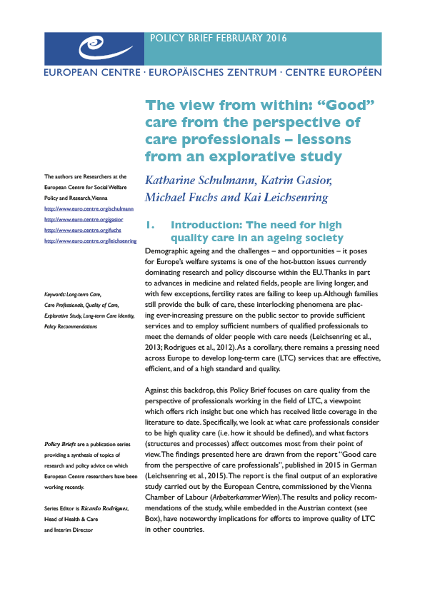 This Policy Brief focuses on the question of how to more appropriately define and measure high quality LTC, summarising findings from the 2014-2015 European Centre project, ‘Good care from the care workers’ perspective’, commissioned by the Vienna Chamber of Labour (Arbeiterkammer Wien). The explorative study investigated how the numerous occupational groups working in LTC in Austria perceive quality of care and what they identify to be the main structural-, process- and outcome-related factors at play in improving care services.