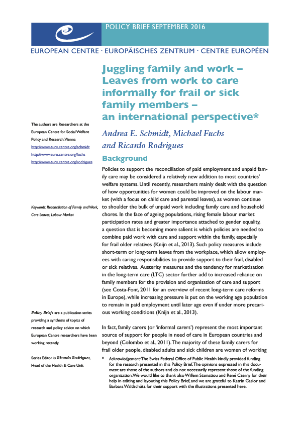 The objectives of this Policy Brief are twofold. Firstly, it aims to draw some lessons for the design of care leave policies, based on an in-depth analysis and international comparison of 22 different care leave regulations in six different countries. Seven key objectives are defined which may help to develop or improve care leave policies, including labour market attachment of caregivers, their income security, and gender equality between caregivers. In practice, there were often trade-offs between these different objectives when designing care leave schemes.