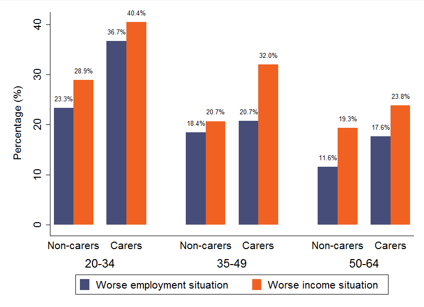 Figure 2: Percentage of individuals that experienced a deterioration in their employment and income situation by carer-status and age (%)