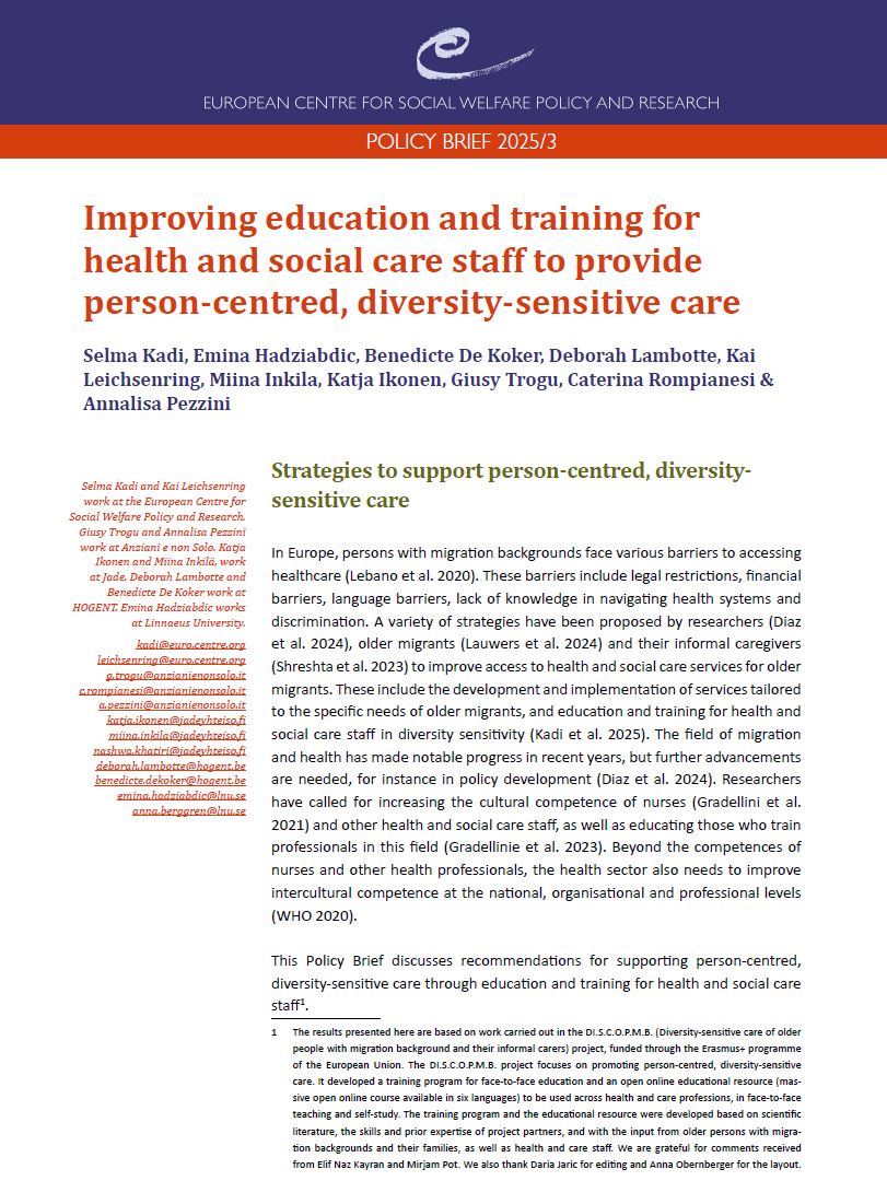 In Europe, individuals with migration backgrounds encounter various obstacles when trying to access healthcare. These obstacles include legal restrictions, financial barriers, language issues, lack of knowledge in navigating health systems, and discrimination. This Policy Brief presents recommendations for supporting person-centred, diversity-sensitive care through education and training for health and social care staff. These recommendations regarding the content and formats of education and training to enhance diversity sensitivity were developed collaboratively based on five workshops held in Austria, Sweden, Italy, Finland, and Belgium, which included older persons with migration backgrounds and professionals from health and social care services.