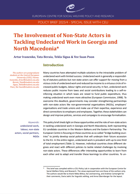 Many countries have tried to implement various solutions to address the persistent issue of undeclared work, with limited success. While undeclared work primarily falls under the scope of statutory policies, non-state actors can provide valuable support in transitioning from a detrimental cycle of undeclared work and diminished tax revenue to a virtuous cycle characterised by increased public budgets, labour rights, and social security. This policy brief examines the opportunities for addressing undeclared work in Georgia and North Macedonia, both of which are candidate countries for European Union accession in the Eastern Partnership and the Western Balkans, respectively. The European Centre concentrates on these nations as “Bridge Building countries,” aiming to collaboratively develop social policies that will facilitate their future integration into the European Union.