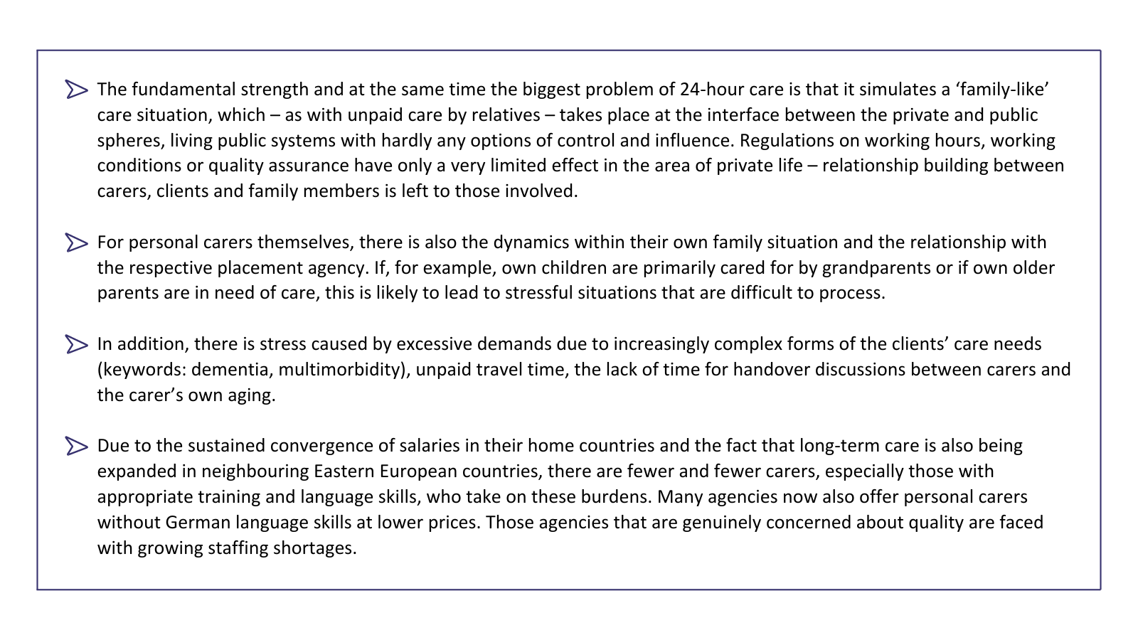 Overall, 24-hour care was and continues to be praised as a win-win model for everyone involved. However, the pandemic also made the fragility of 24-hour care visible (Kadi et al., 2023; Leichsenring et al., 2022; Leiblfinger et al., 2020). It was not just the border closures that evidenced such fault lines, but also the social isolation in which most personal carers and their clients (mostly over 80 years old) spend their everyday lives together. Those who were in the country during lockdowns worked under particularly precarious conditions for months, and those who were in their home country during that period had to persist without work and income. This situation made the precarious working conditions most visible – and even more: