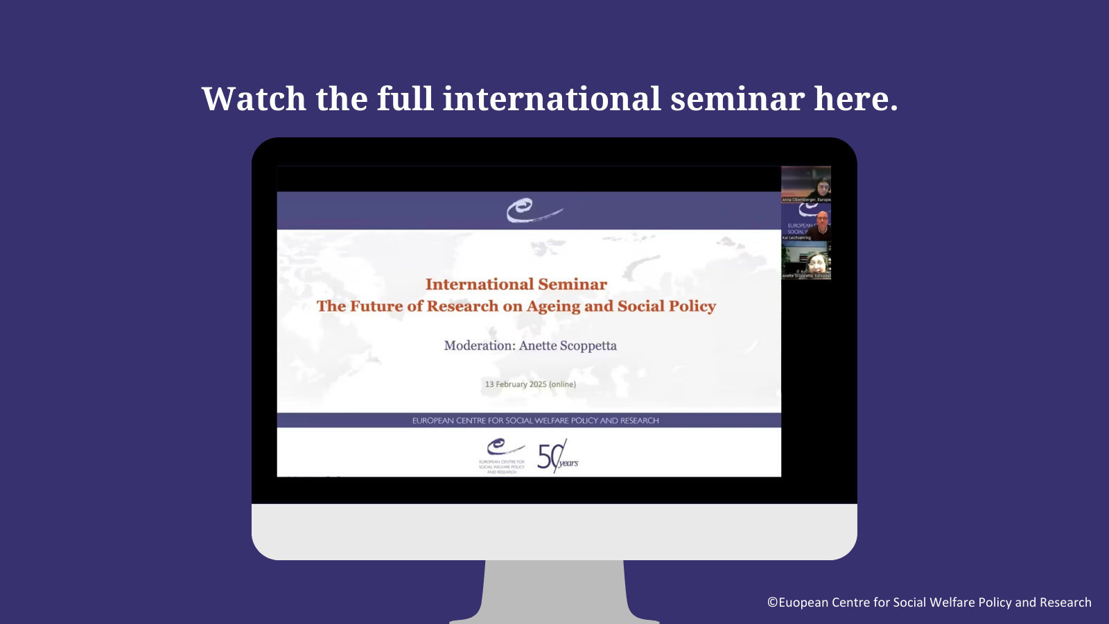Over the past year, the European Centre organised five international Seminars to launch and discuss the book A Research Agenda for Ageing and Social Policy, edited by Kai Leichsenring and Alexandre Sidorenko. To conclude this series, we examined the changing national and international contexts and potential next steps with authors and other stakeholders for research on ageing.
