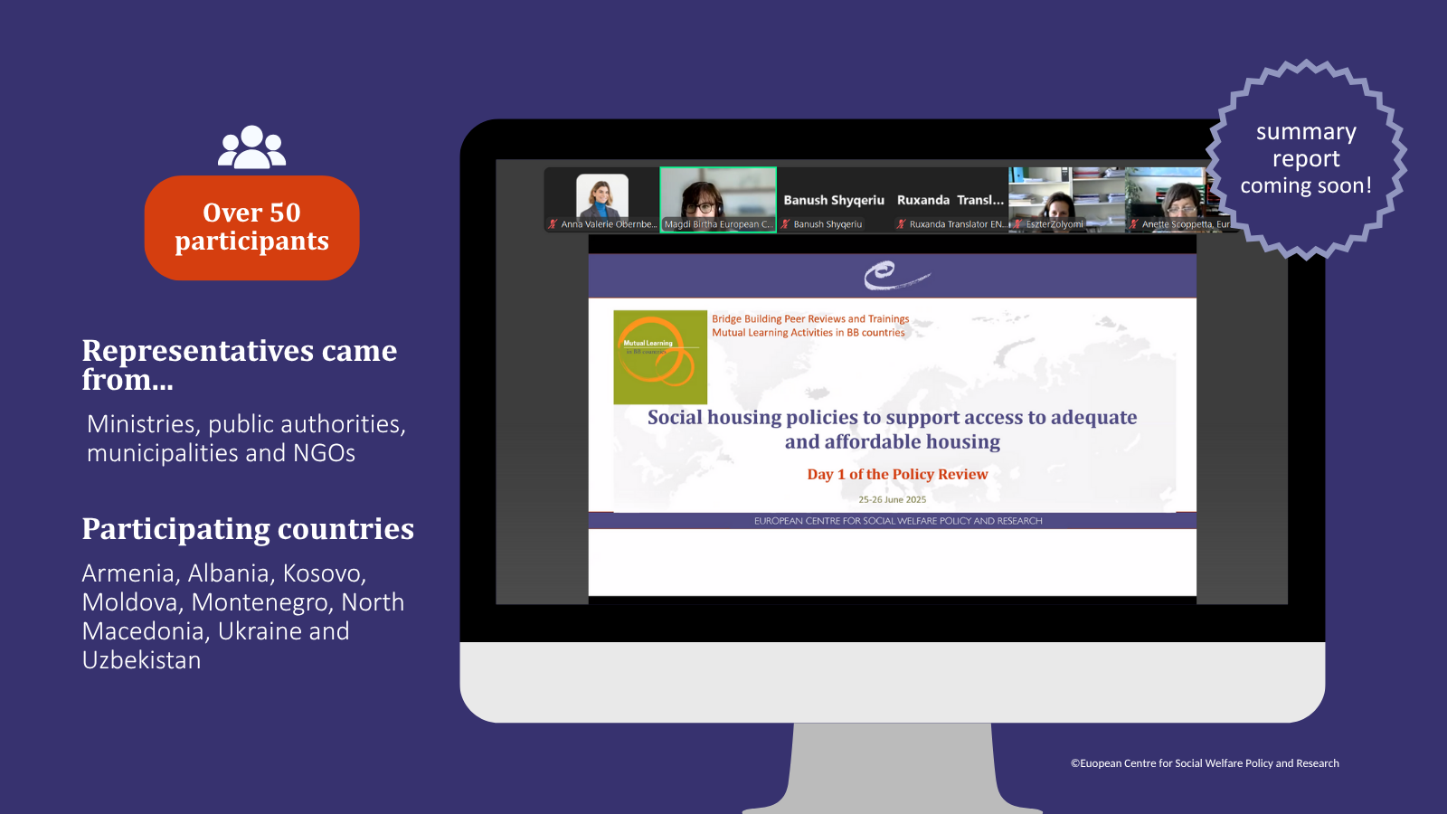 The current availability and options for social housing in the countries of the Western Balkan and Eastern Partnership vary, with generally little being available. There is, however, a growing demand to expand these services, especially in countries facing acute challenges to their housing capacity, e.g., due to forced migration. In the most recent Bridge Building (BB) Policy Review event titled ‘Social Housing Policies to Support Access to Adequate and Affordable Housing’, held on 25–26 June 2025 and organized by the European Centre as part of its BB function, in collaboration with the Ministry of Labor and Social Affairs of the Republic of Armenia – social housing was examined in depth. The event featured presentations from national social housing experts working in Bridge Building countries (Armenia and Kosovo), perspectives from those working within the EU (Housing Europe and City of Vienna), as well as an examination of financing opportunities from international funding bodies (European Commission and Council of Europe Development Bank).